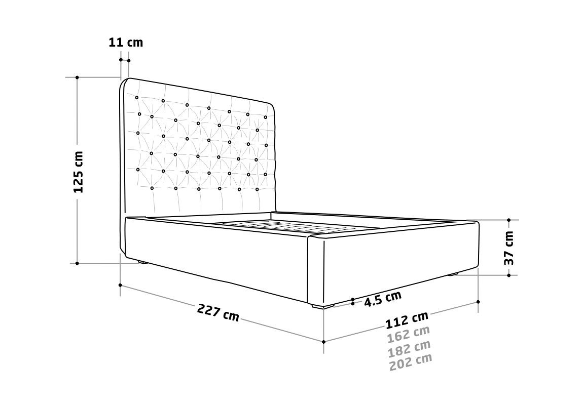 Tetiera căptușită cu nasturi decorativi oferă patului un plus estetic și modern, ceea ce permite integrarea cu ușurință a acestuia în mai multe stiluri de amenajare. Somiera este inclusă, iar sistemul rabatabil al acesteia permite accesul cu ușurință la lada generoasă de depozitare, având același perimetru cu dimensiunea patului.