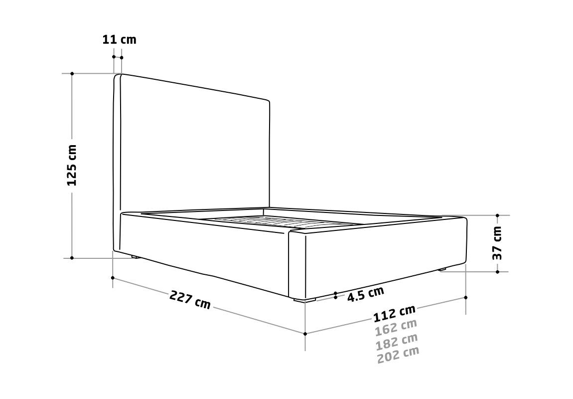 Piesa este tapițată cu stofă tip catifea, foarte fină, plăcută la atingere și cu reflexii sublime, care îi oferă un aspect extrem de elegant. Tetiera căptușită, cu design simplu, oferă patului un aspect estetic și contemporan, ceea ce permite integrarea cu ușurință a acestuia în mai multe stiluri de amenajare. Somiera este inclusă, iar sistemul rabatabil al acesteia permite accesul cu ușurință la lada generoasă de depozitare, având același perimetru cu dimensiunea patului.