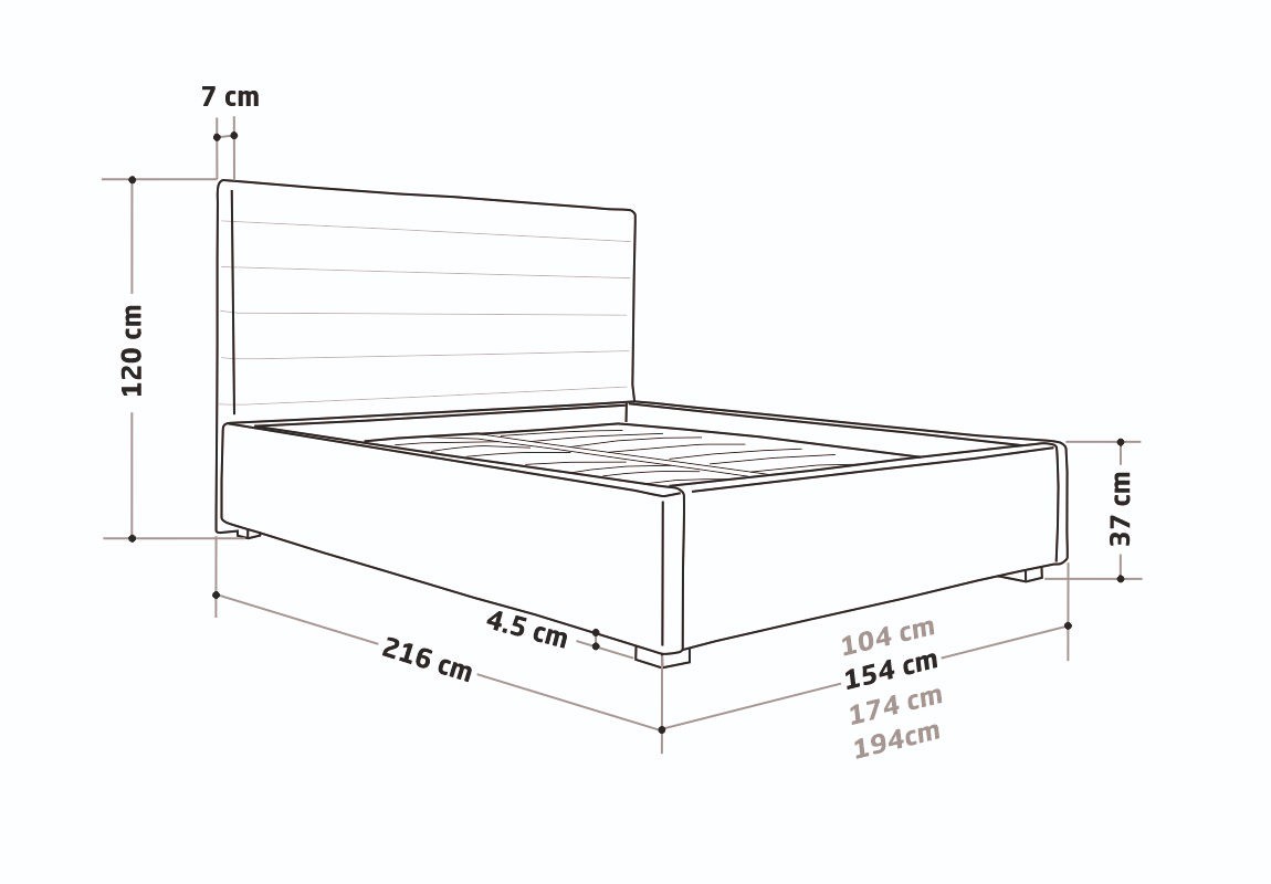 | Dimensiune cadru (cu picioare) | l 104 / 154 / 174 / 194 x L 209 x H 37 cm |