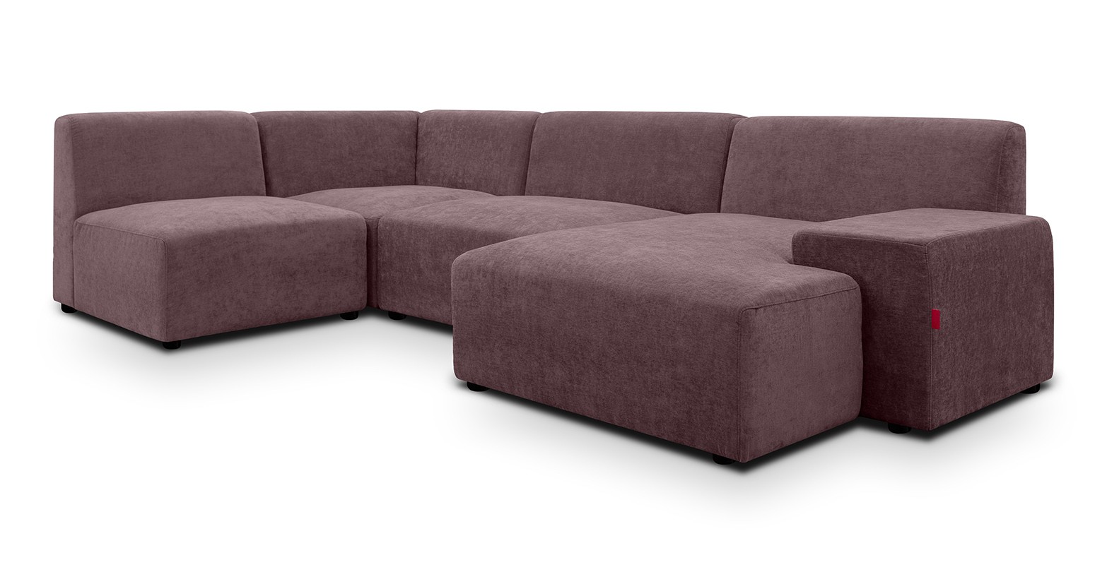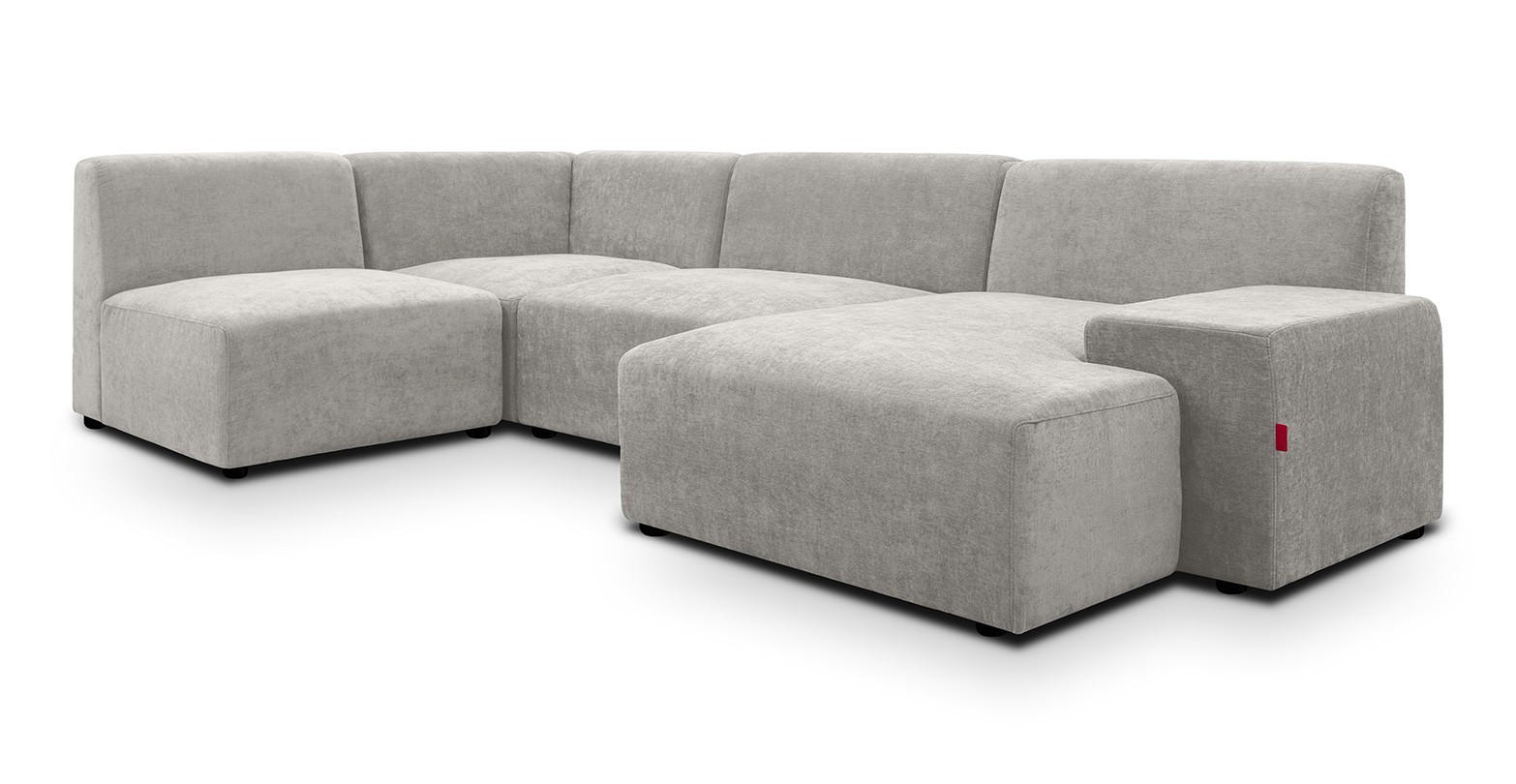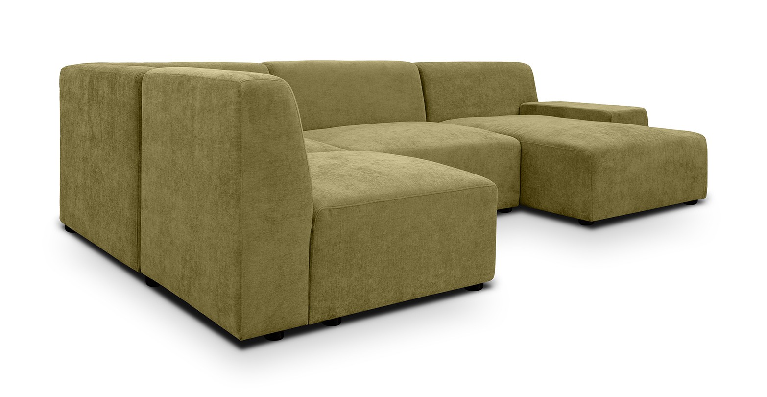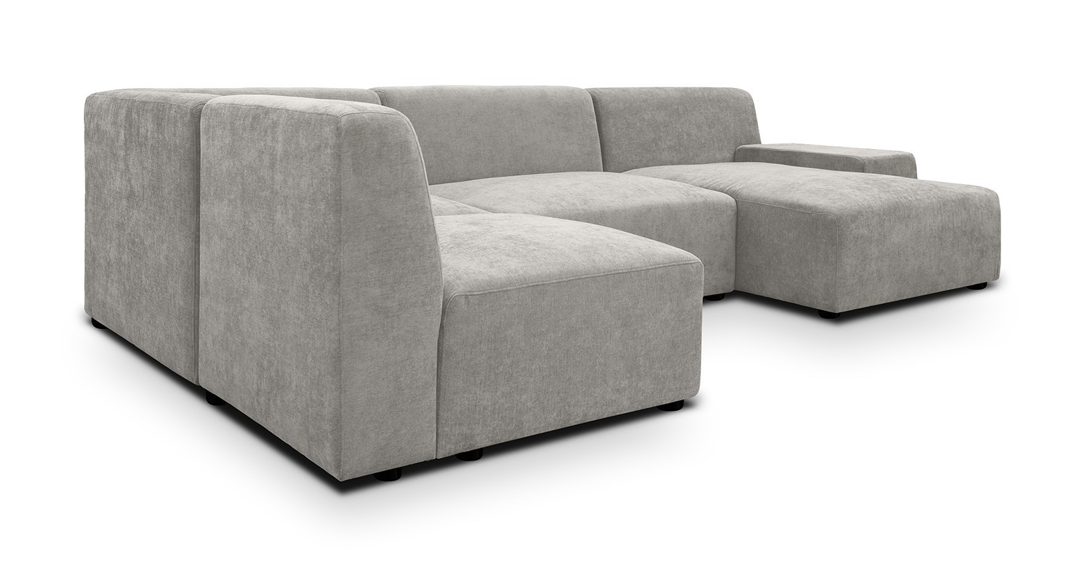 Canapeaua include un modul cu șezlong și un taburet, care conturează ansamblul în formă de „U”.