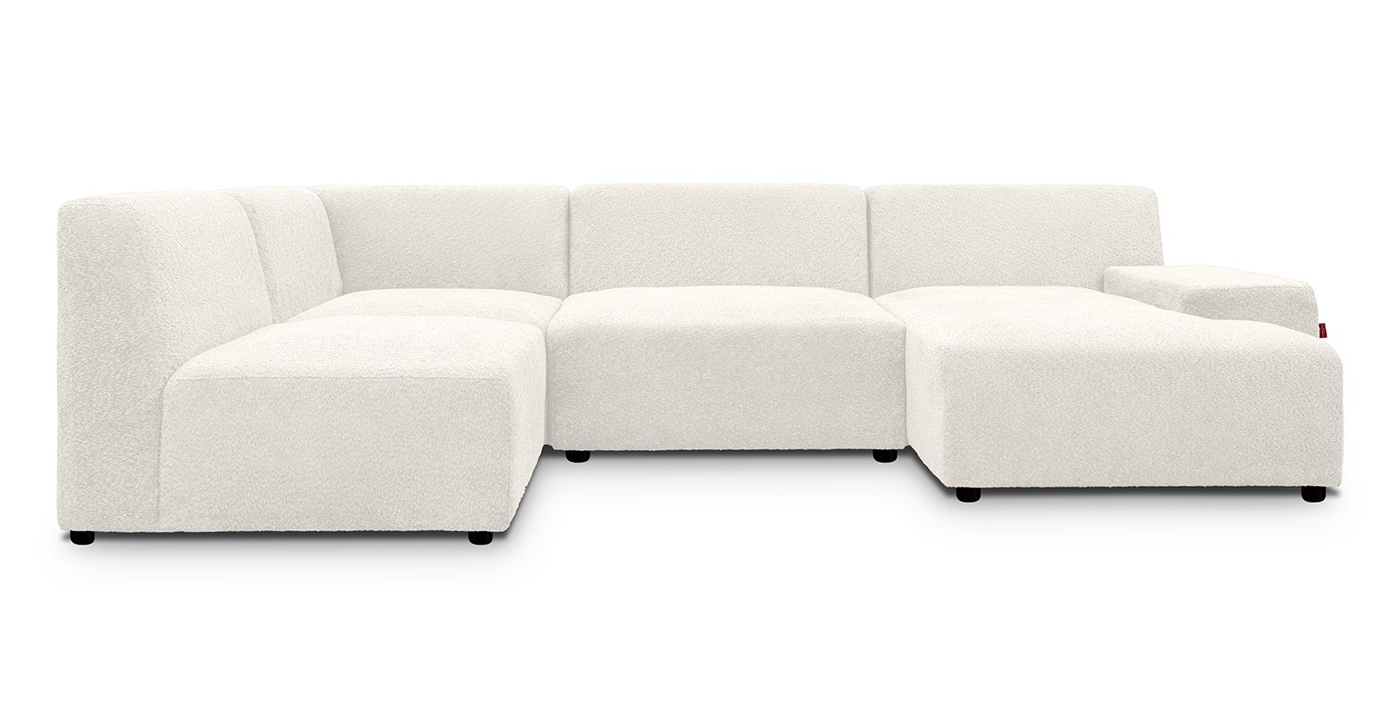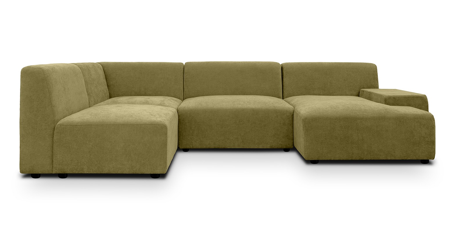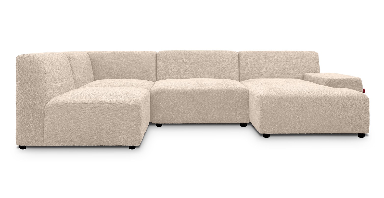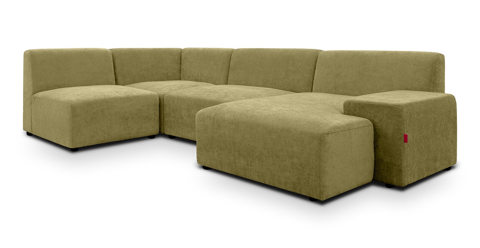Canapeaua include un modul cu șezlong și un taburet, care conturează ansamblul în formă de „U”.