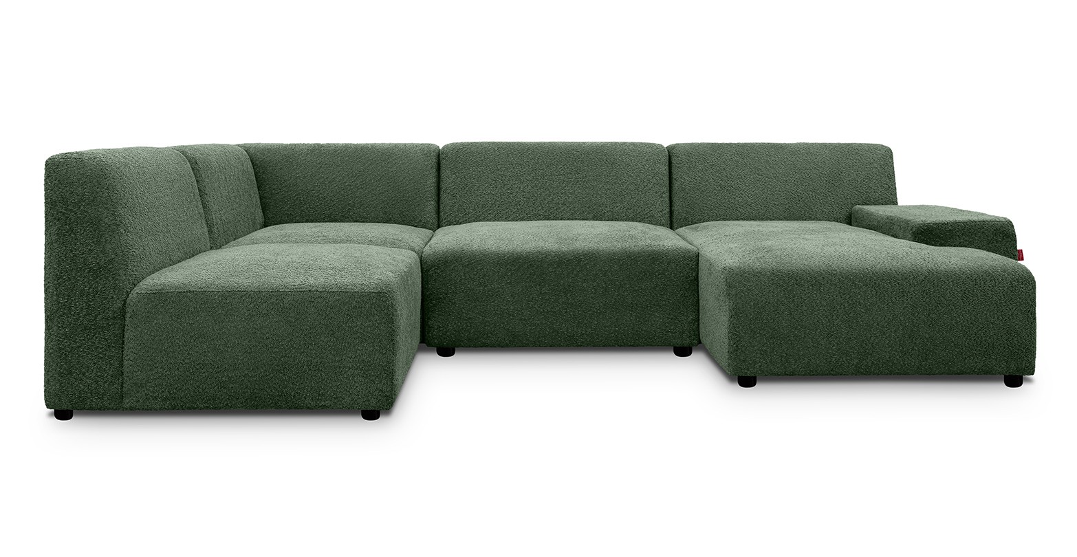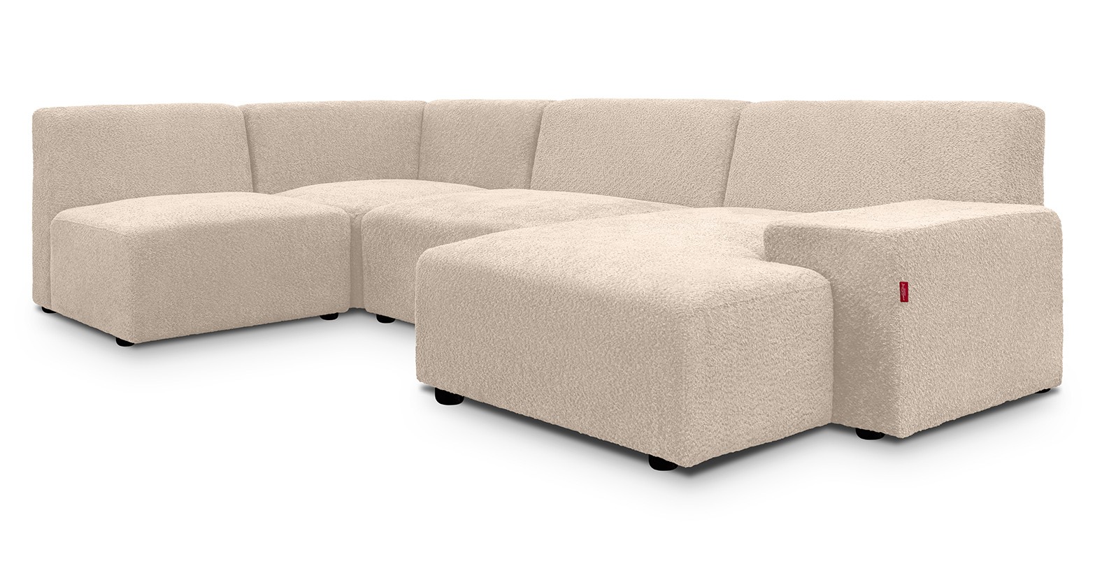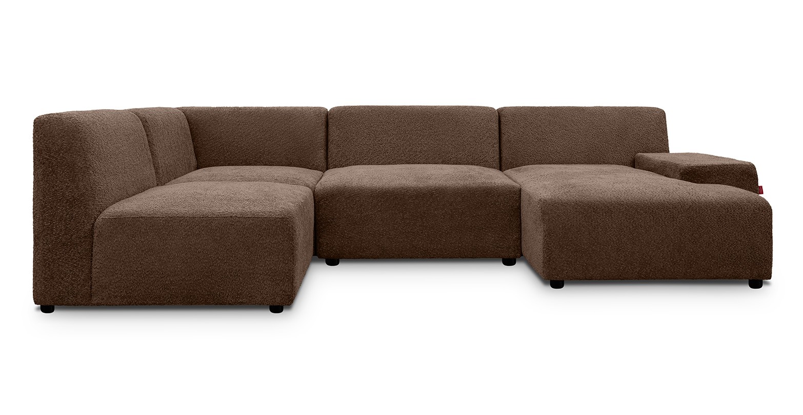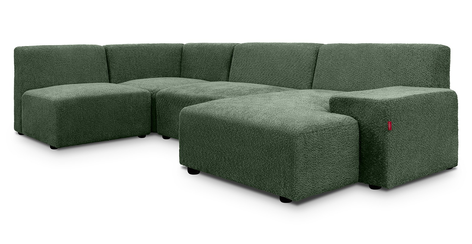 Canapeaua include un modul cu șezlong și un taburet, care conturează ansamblul în formă de „U”.
